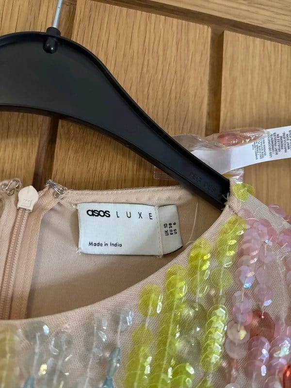 The ASOS Luxe Sequin Dress boasts a stunning array of sequins in various vibrant colors and shapes, creating an eye-catching, elegant piece. Perfect for any special occasion, this dress features a flattering silhouette and comfortable fit, making it a standout addition to any wardrobe.