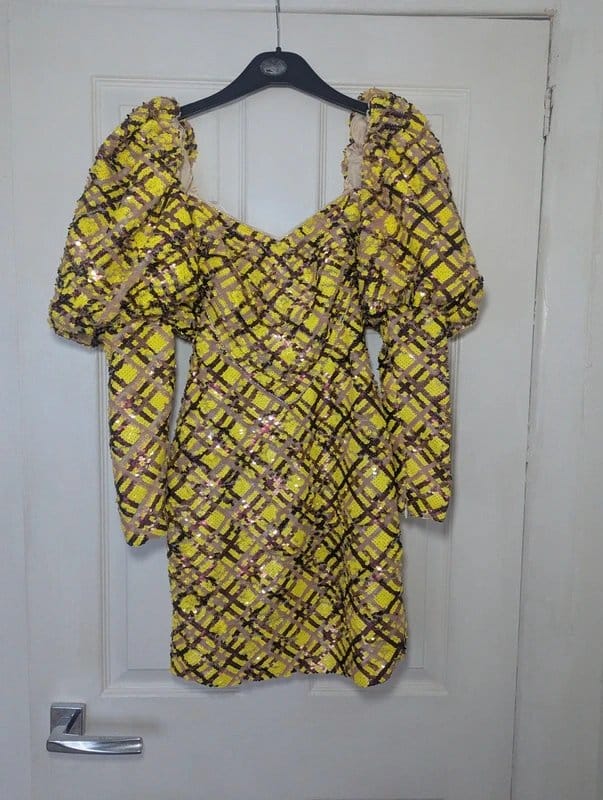Gorgeous sequin check pattern dress in lime and purple. Perfect for festive occasions. Features puff sleeves and a zip back. Crafted from lightweight fabric with subtle shimmer.