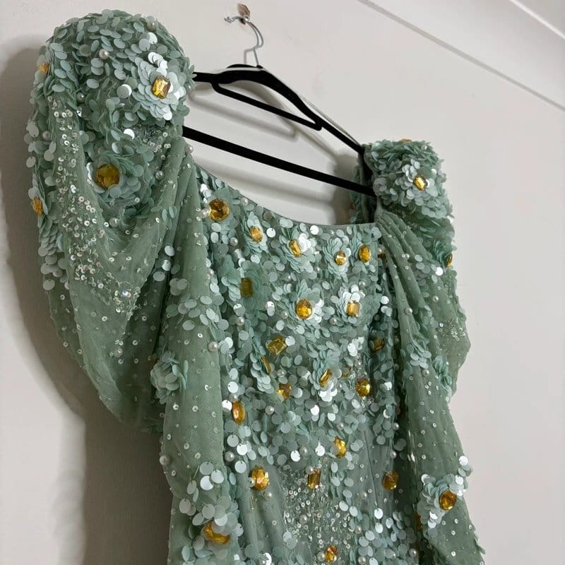 Mint Sequin Embellished Dress — perfect for weddings, parties, and festive events. Crafted in a lightweight chiffon fabric, this short-sleeve dress is adorned with delicate sequins and pearls for a glamorous touch. The sweetheart neckline and balloon sleeves create a romantic, sophisticated look. Ideal for adding sparkle to any occasion.