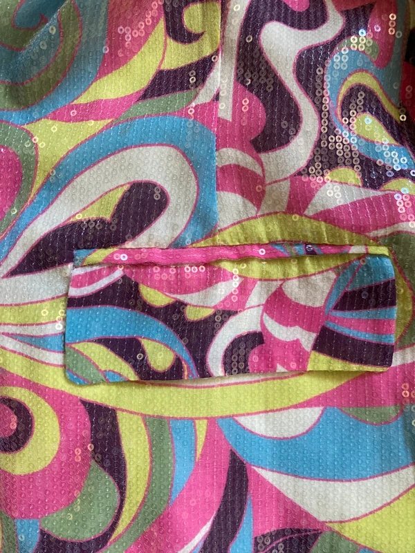 Vibrant Multicolored Sequin Jacket — a standout piece for festive occasions. Featuring a vibrant multicolored sequin print, this jacket offers a casual style with long sleeves. Crafted from lightweight polyester fabric with subtle stretch, it includes decorative pockets and a full-length zip closure. Perfect for party, evening events, and night out.