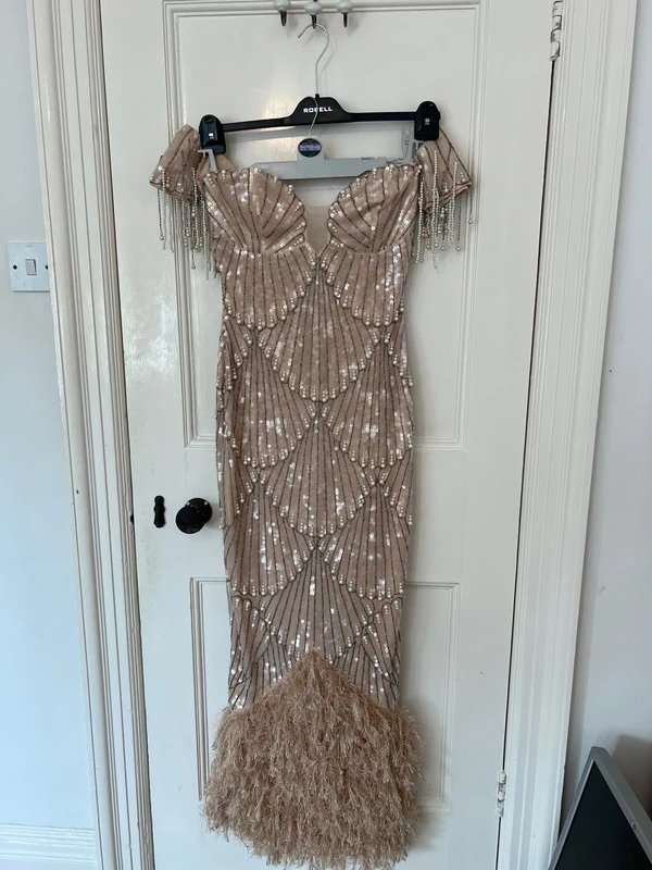 Designed with a plunge neckline and off-shoulder detailing, this long gown features sequin pearl embellishments and faux feather accents. Perfect for a formal or evening occasion.