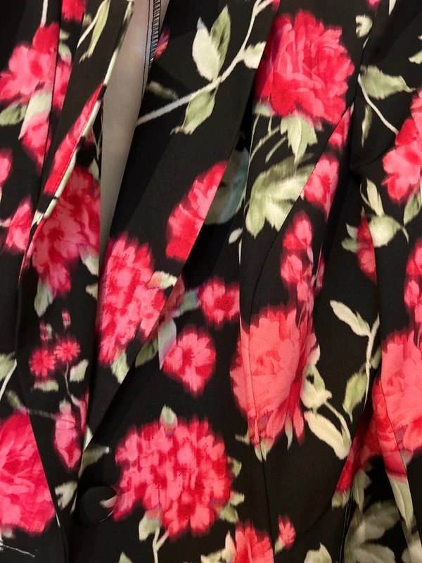 Black and Pink Floral Shoulder Padded Blazer — the perfect addition to your wardrobe for a touch of floral flair. Designed in vibrant black and pink floral print, this shoulder-padded blazer features a classic lapel collar and button closure. Crafted from lightweight satin with a subtle sheen, it adds a touch of elegance to any outfit. Ideal for layering over your favorite tops and jeans.