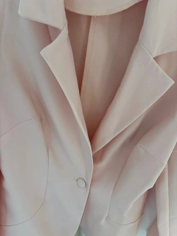 Stylish blush pink blazer by ASOS, crafted from stretchy material with a modern fit. Features shoulder pads for a structured silhouette, a lapel collar, and front button closure. Ideal for professional or smart-casual occasions.
