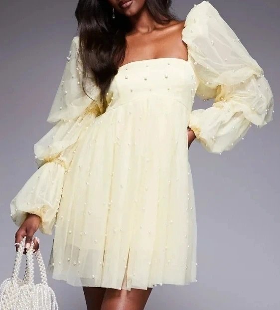 Vibrant yellow tulle baby doll dress with puff sleeves and pearl embellishments. Features a flattering off-shoulder neckline, a gathered bodice, and a full tulle skirt. Perfect for beach parties, date nights, and special occasions. Crafted from lightweight sheer tulle, this dress catches the light beautifully and adds a touch of glamour to any outfit. Includes full-length jersey slip lining for comfort and coverage.