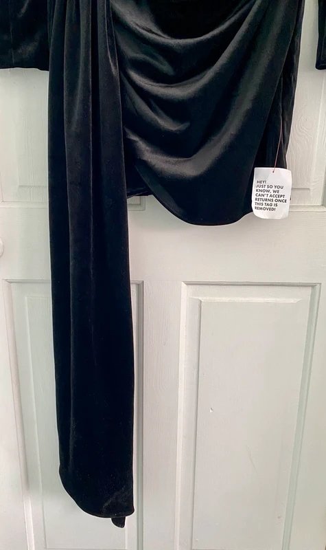 The ASOS Luxe Velvet Bow Drape Mini Dress in Black is available in sizes L.