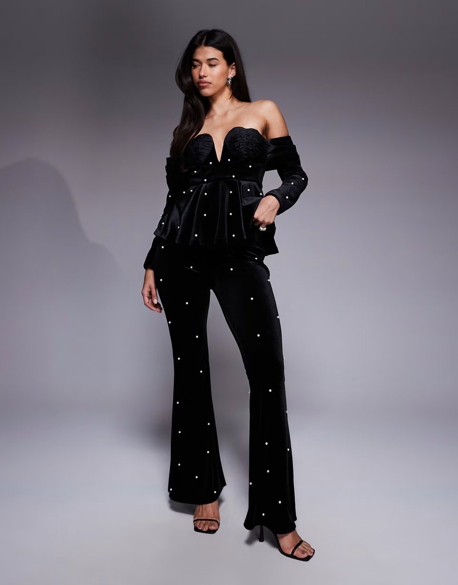 The ASOS LUXE Velvet Pearl Embellished Trousers in Black is ideal for evening, casual.