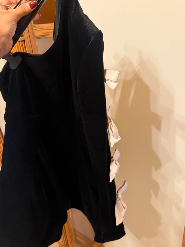 Black Off-Shoulder Mini Dress with Cream Bows — the perfect addition to your evening wardrobe. Designed in luxe velvet, this off-shoulder mini dress features cream bows for a touch of elegance. Crafted from velvet, it offers a rich texture and a flattering fit. Ideal for evening events, cocktail parties, and special occasions.