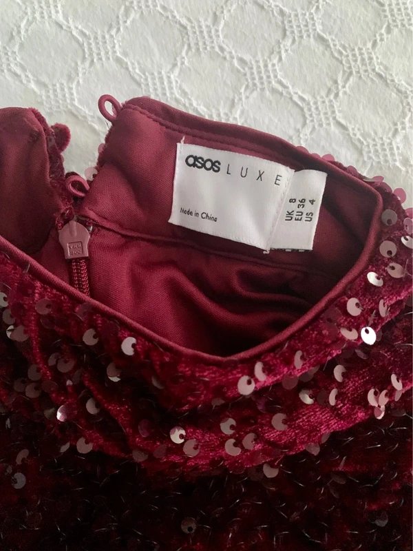 The burgundy velvet sequin maxi dress from ASOS Luxe is a stunning piece designed for elegant occasions. Featuring a drape waist and a floor-length silhouette, it's perfect for a formal evening out.