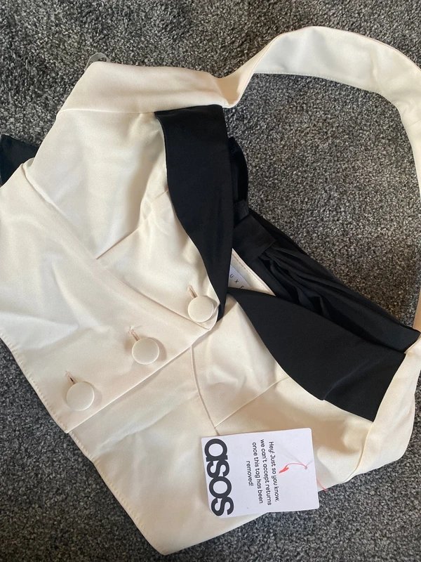 Elegant and stylish, this cream waistcoat by ASOS features a black bow at the front. Crafted for a button closure, it adds a touch of sophistication to any outfit.