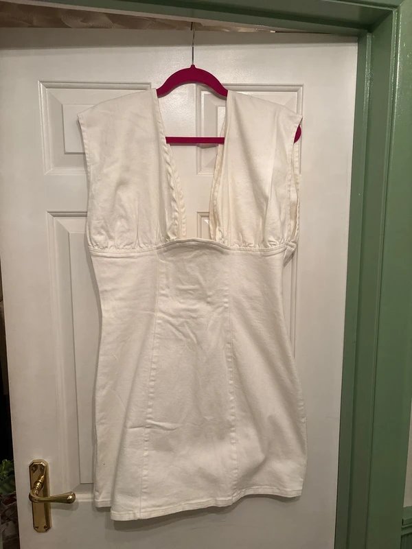 The ASOS Luxe White Denim Plunge Neck Mini Dress is available in sizes L.