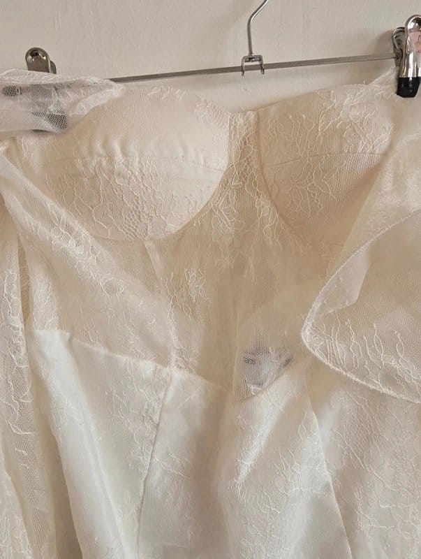 Elegant white lace off-shoulder dress with a structured bodice and dramatic ruffle sleeves. Features sheer lace overlay, built-in cups for support, and embellished cuffs. Perfect for special occasions.