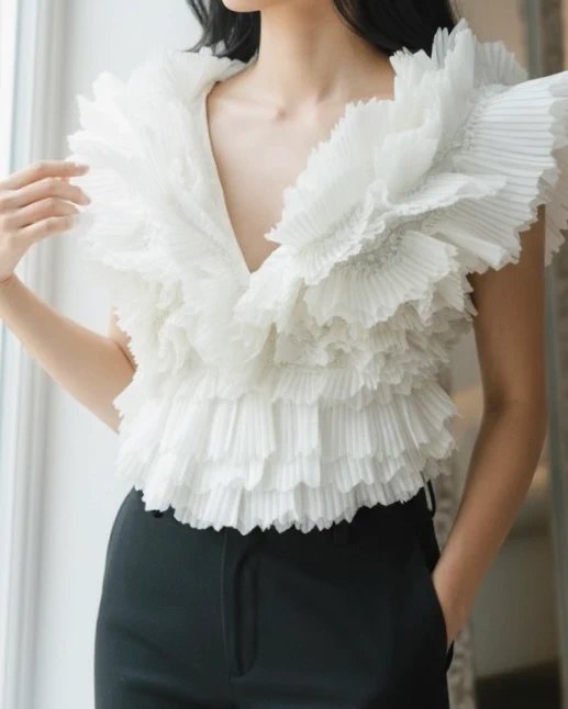 White Pleated Frilly Sequinned V Neck Top — the must-have occasion top for special events. Designed in layered pleated satin in white, this V-neck top features frilly ruffles and sequin embellishments for a glamorous look. Crafted from lightweight satin with subtle shimmer, it catches the light beautifully. Perfect for evening events, parties, and formal occasions.