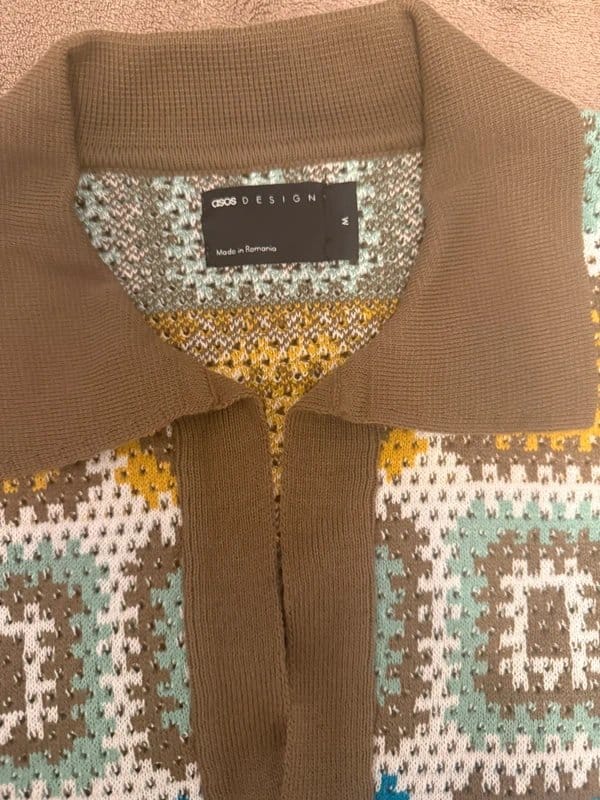 The ASOS Men Turquoise & Mustard Knit Polo Shirt is available in sizes M.