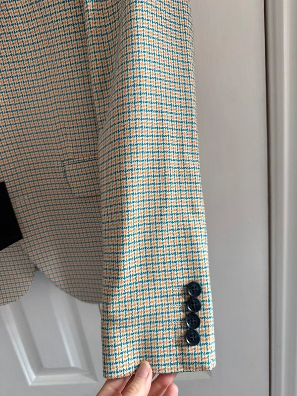 Blue and Orange Check Blazer — the perfect addition to your summer wardrobe. Designed with a blue and orange check pattern, button closure, slim fit, and two-button front. Ideal for a summer wedding or any smart-casual event.