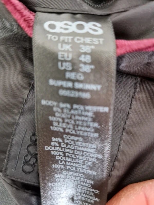 Stylish burgundy blazer from ASOS, crafted from polyester fabric. Features a super skinny fit and a classic lapel collar. Perfect for formal occasions or smart-casual ensembles.