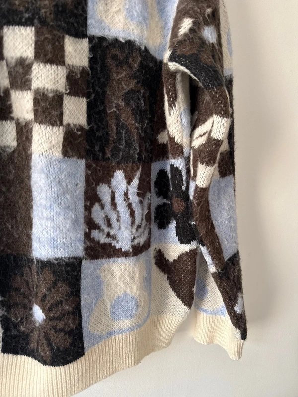 Brown/blue/cream knitted jumper — the ultimate cozy layer for casual, smart-casual, and weekend wear. Designed with brushed, fluffy texture, checkered pattern, crew neckline, long sleeve, relaxed fit, knitted. Features a versatile, casual style for layering.