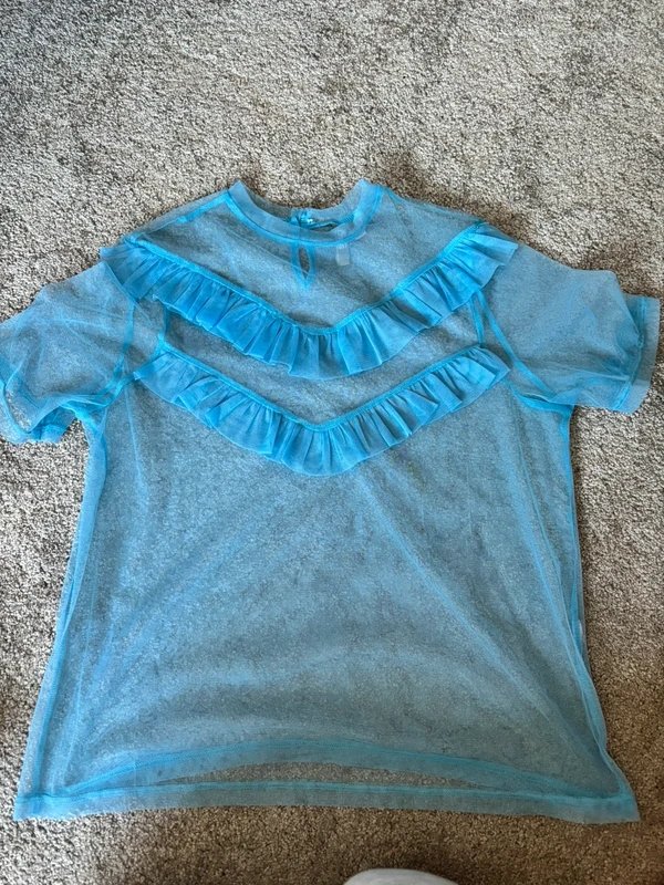 The ASOS Mesh Frill Neck Light Blue Top is available in sizes S.