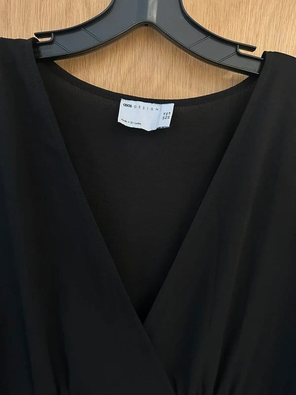 Elegant ASOS midi dress in black with angel sleeves and a flattering wrap silhouette. Perfect for evening events or date nights.