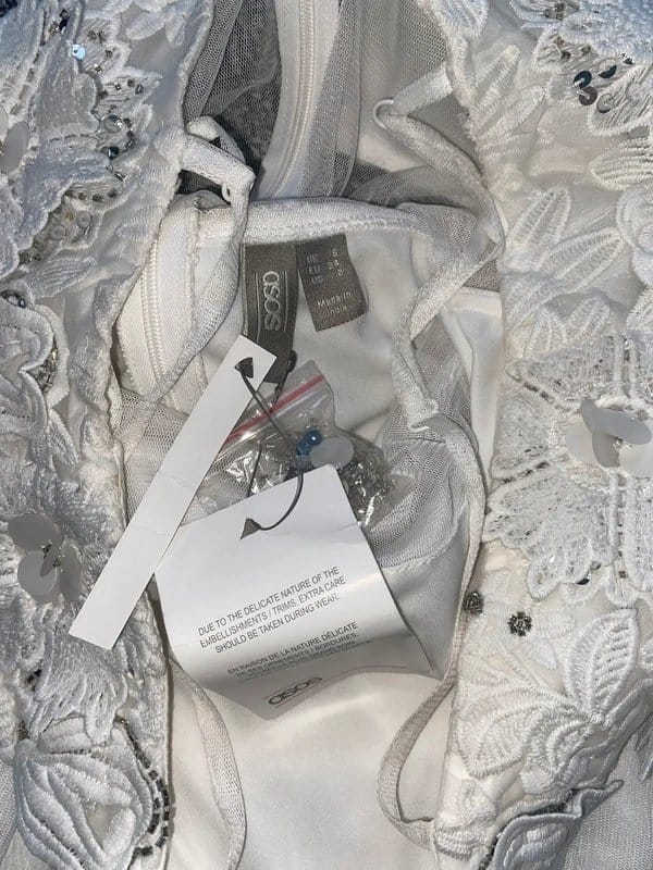The ASOS design luxe features an embellished white tulle skirt, perfect for a bridal or prom evening. The dress has a slim fit and a sheer neckline, making it an ideal choice for special occasions.