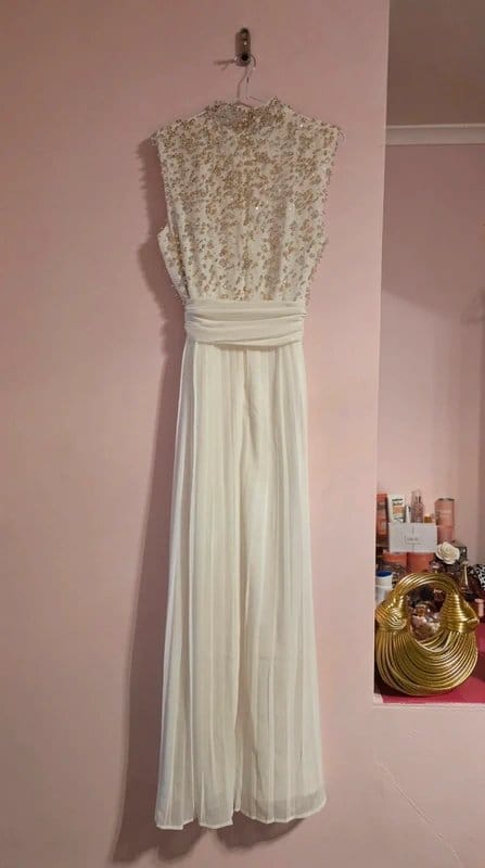 This white chiffon maxi dress is embellished with pearls, beads, sequins, and diamontes. It features a round neckline and sleeveless design, with a pleated skirt that flows to the floor. Fully lined and secured with a back zip and a chiffon tie at the waist.
