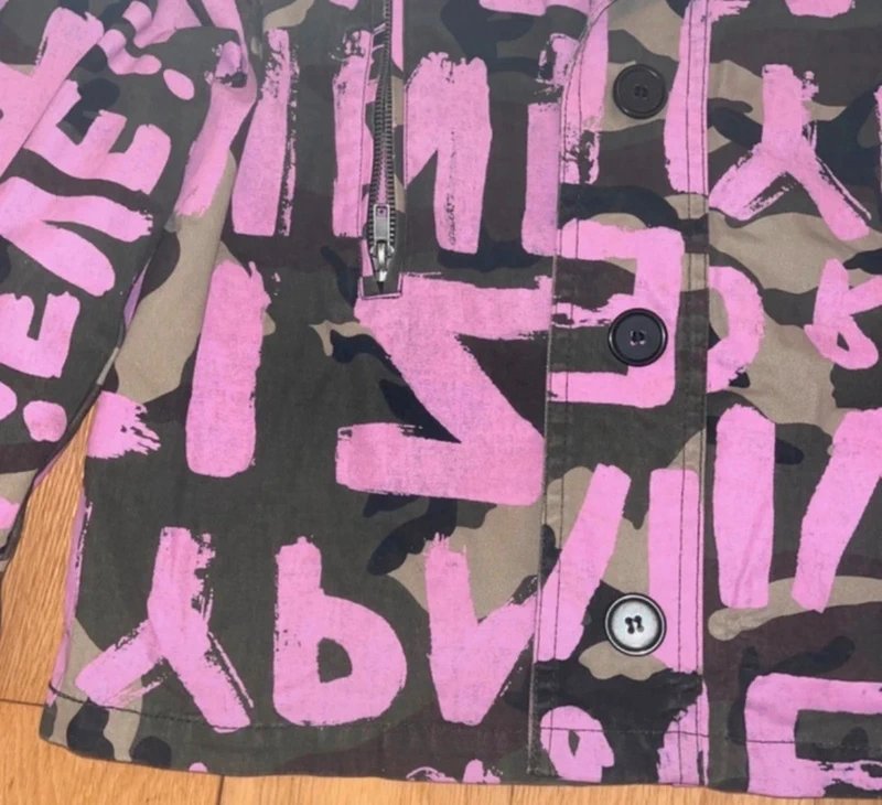 The ASOS Pink Graffiti Print Camo Jacket is available in sizes M.