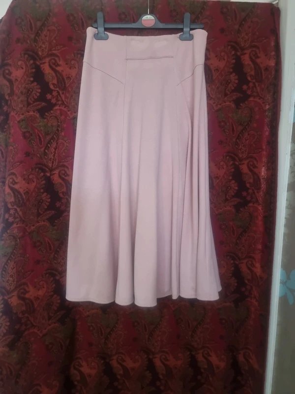 Crafted with a soft pink hue, this midi flowy skirt features a full skirt that flows gently around the legs, perfect for a feminine and graceful look.