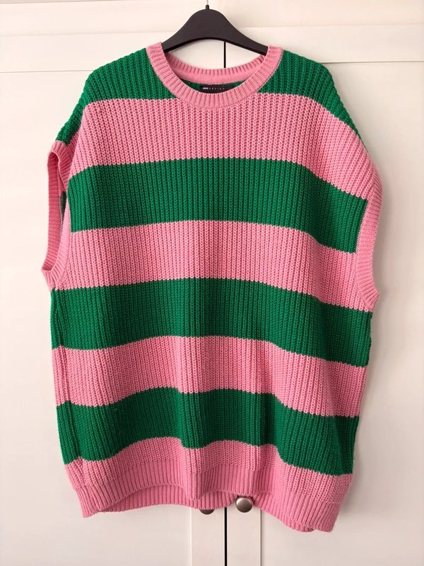 Very retro striped jumper from ASOS. Designed in a vibrant pink and green striped pattern, this oversized jumper is perfect for a relaxed, casual look. Crafted from a cozy knit fabric, it features a crew neckline and long sleeves for added warmth. Ideal for layering over your favorite tees or wearing on its own for a bold statement.