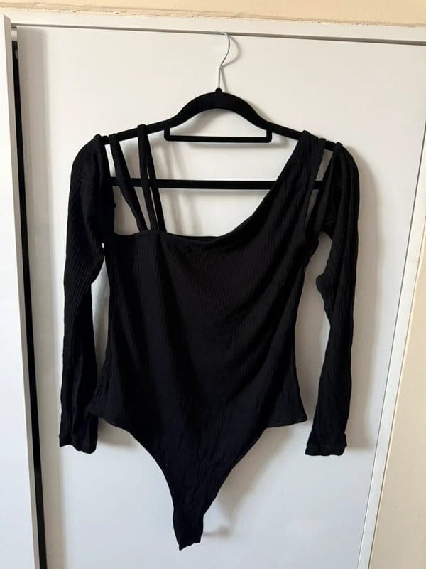 Sleek black ribbed bodysuit by ASOS with an off-shoulder neckline and crisscross straps. Features long sleeves and a fitted silhouette that flares slightly at the hips. Perfect for a modern, edgy look.