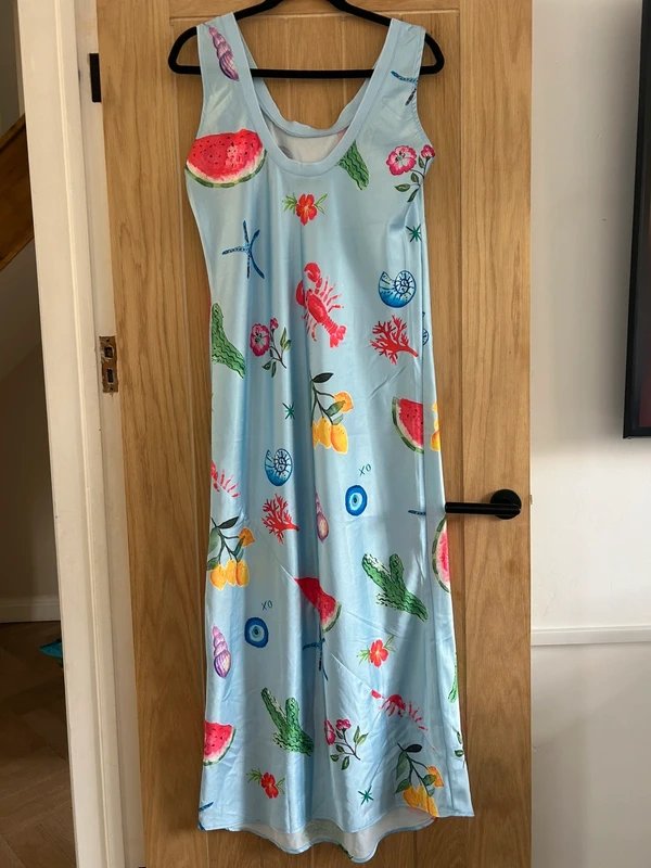 The ASOS Light Blue Satin Dress is available in sizes M.