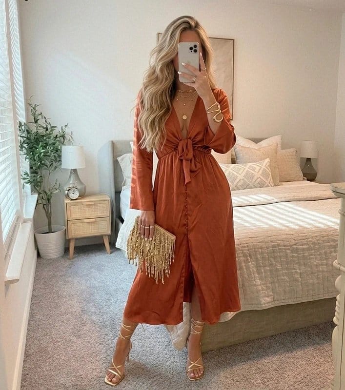 Gorgeous deep coral colour and the satin feels really lovely on ✨ Very flattering tie front detail and button down skirt, perfect for summer weddings 💕