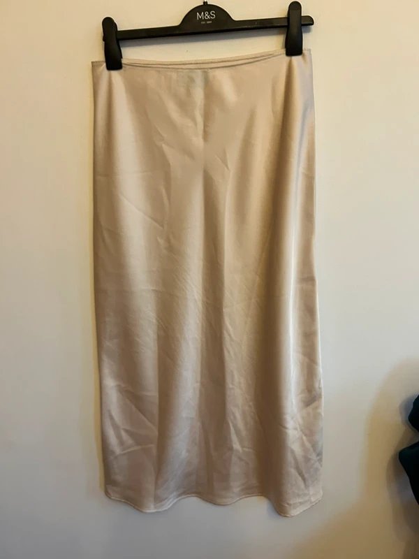 The ASOS Satin Midi Skirt in Champagne/Nude is available in sizes M.