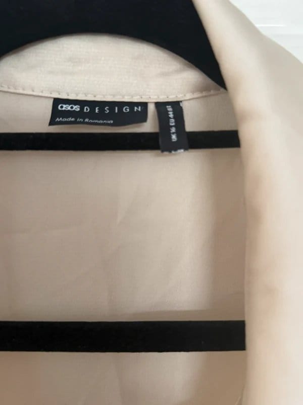 The ASOS Beige Satin Oversized Shirt with Tie Detail – Size 16 is made from satin.