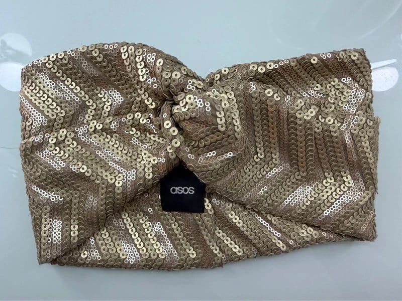 The ASOS Sequin Headband in Gold is available in sizes XXXL, XXL, XL, XS, L, M, S.