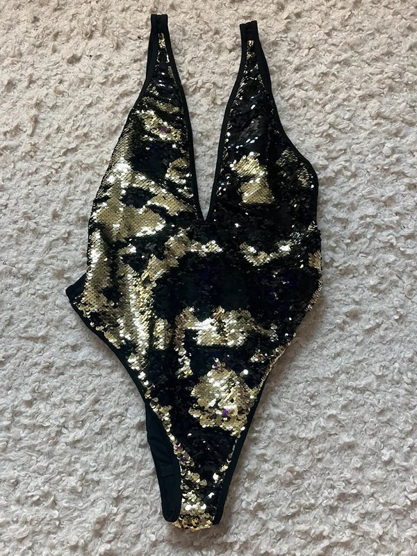 Black and gold sequin swimsuit — perfect for beach parties and pool days. Crafted from stretchy polyester fabric with sparkly sequin embellishments, it offers a flattering fit and a shimmering appearance. Ideal for making a statement at the beach or pool.