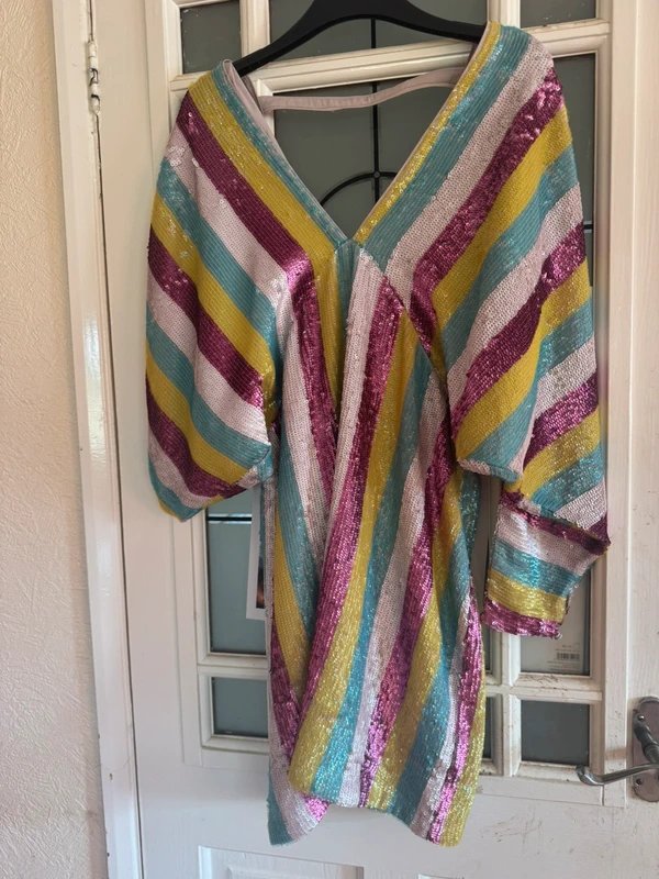 This multi-colored sequinned dress from ASOS features a batwing mini silhouette and is perfect for making a statement. The sequinnned detailing adds a touch of glamour suitable for evening outings.