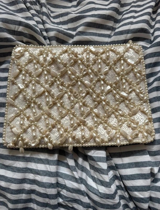 Elegant cream embellished clutch bag with pearl accents and intricate detailing, perfect for adding a touch of sophistication to any outfit.