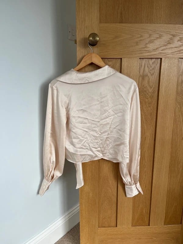 The ASOS Champagne Silk Cropped Tie Front Shirt is available in sizes S.
