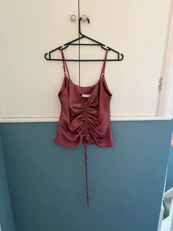 The ASOS Silk Ruched Top in Burgundy is available in sizes S.