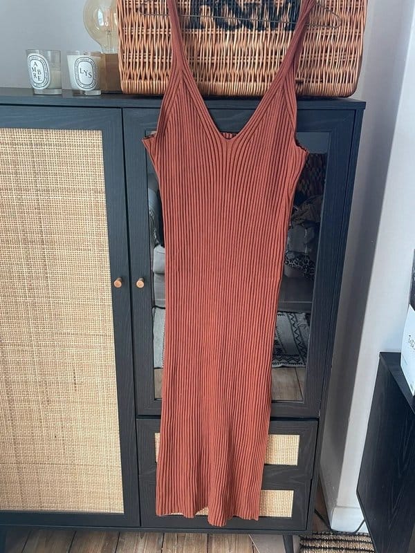 This ribbed tan midi dress from ASOS features a side split and a V-neckline. Made from stretchy ribbed fabric, it offers a flattering fit and is perfect for casual outings.