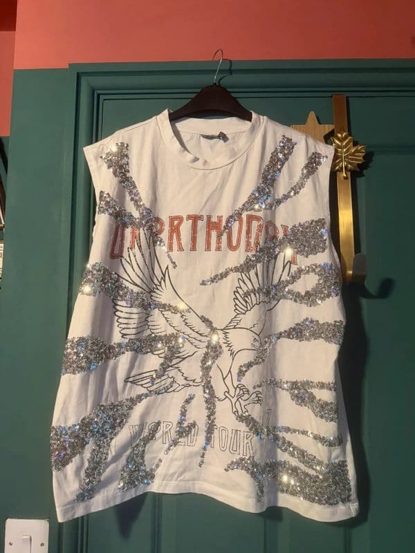View Vinted's returns policyThis ASOS oversized band top features a sequin embellished front with a striking graphic design. Made from soft cotton, it offers a relaxed fit perfect for casual outings.