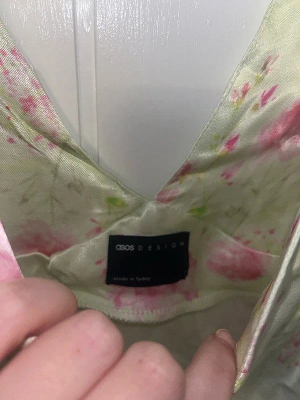 This multi-coloured floral satin dress by ASOS features a V-neckline and a flowing silhouette. The satin fabric adds a touch of elegance, making it perfect for summer events or casual outings.