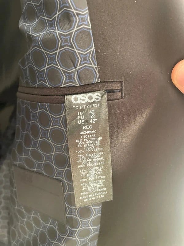 The ASOS Black Polyester Tuxedo Suit & Trousers is made from polyester, viscose, elastane.