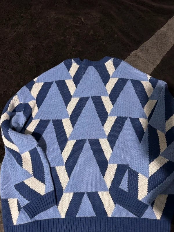 Stylish ASOS jumper in navy blue and light blue with a geometric pattern. Made from knitted fabric for a comfortable fit. Ideal for casual wear.