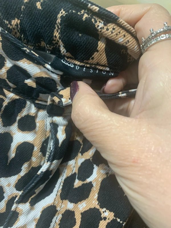 The ASOS Leopard Denim Short Shorts is available in sizes L.