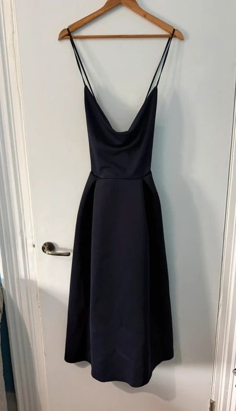 “Pair with navy satin heels and a matching clutch for a cohesive formal look.”
