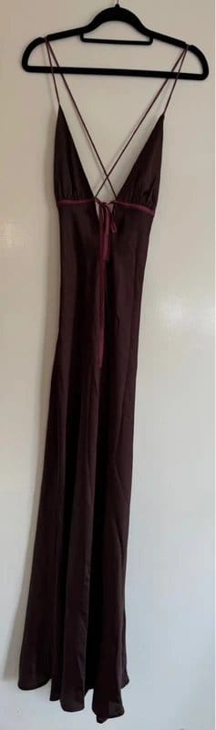 This burgundy satin dress features a tie-back neckline and adjustable straps. The flowing silhouette and elegant fabric make it perfect for evening events or special occasions.