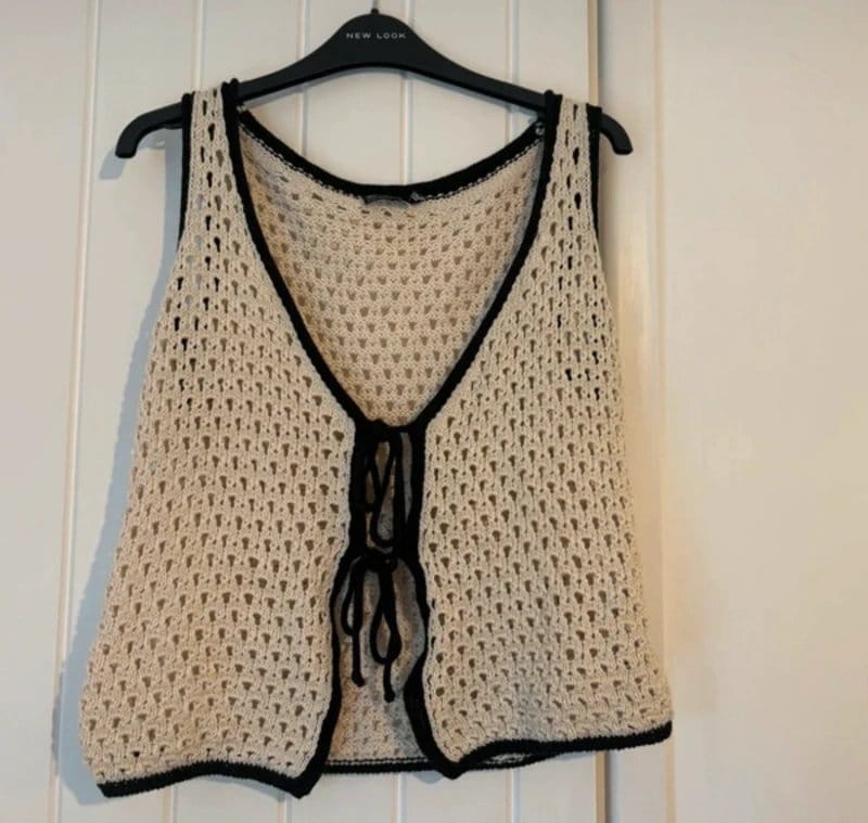 The ASOS Beige Crochet Vest with Black Trim is available in sizes M.