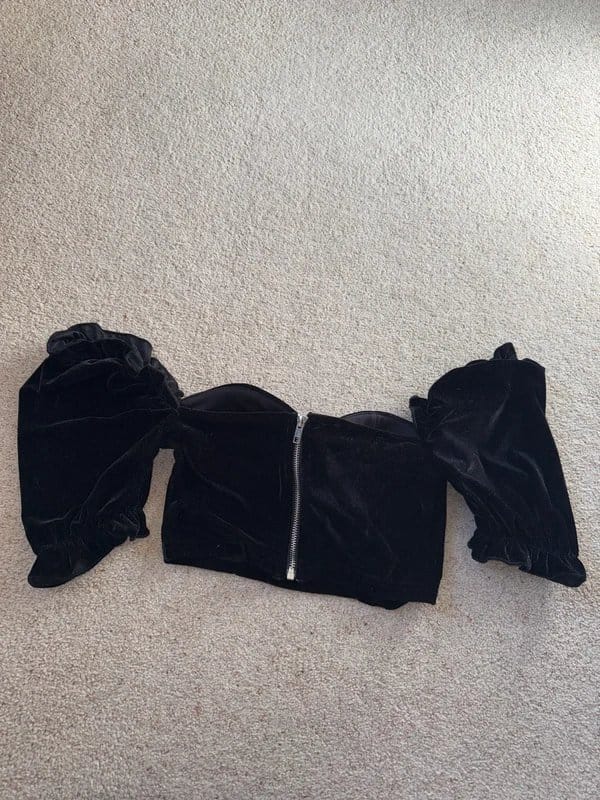 Adorned in a luxurious velvet fabric, this off-the-shoulder Bardot crop top by ASOS is perfect for adding a touch of elegance to your wardrobe. The size 10 garment features a zip closure at the back for easy wear.