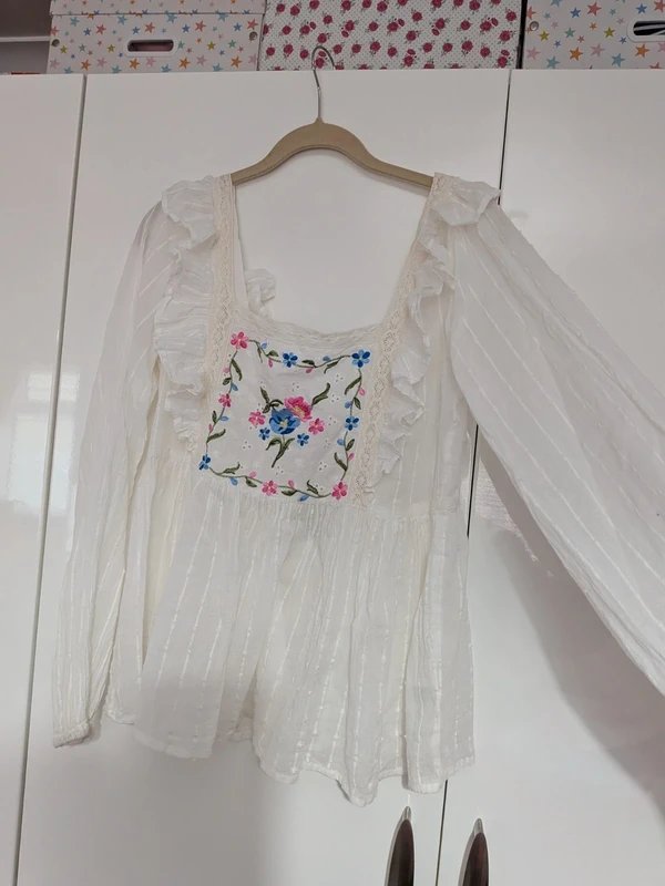 This white embroidered floral blouse features a whimsical design with intricate embroidery details on the front and a charming tie back design. The blouse has an airy feel, perfect for a casual day out or a light evening event.