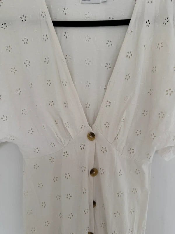 This white floral eyelet maxi dress from ASOS is perfect for summer. It features a V-neckline, button placket, and a flowing A-line silhouette. Ideal for casual outings and beach vacations.